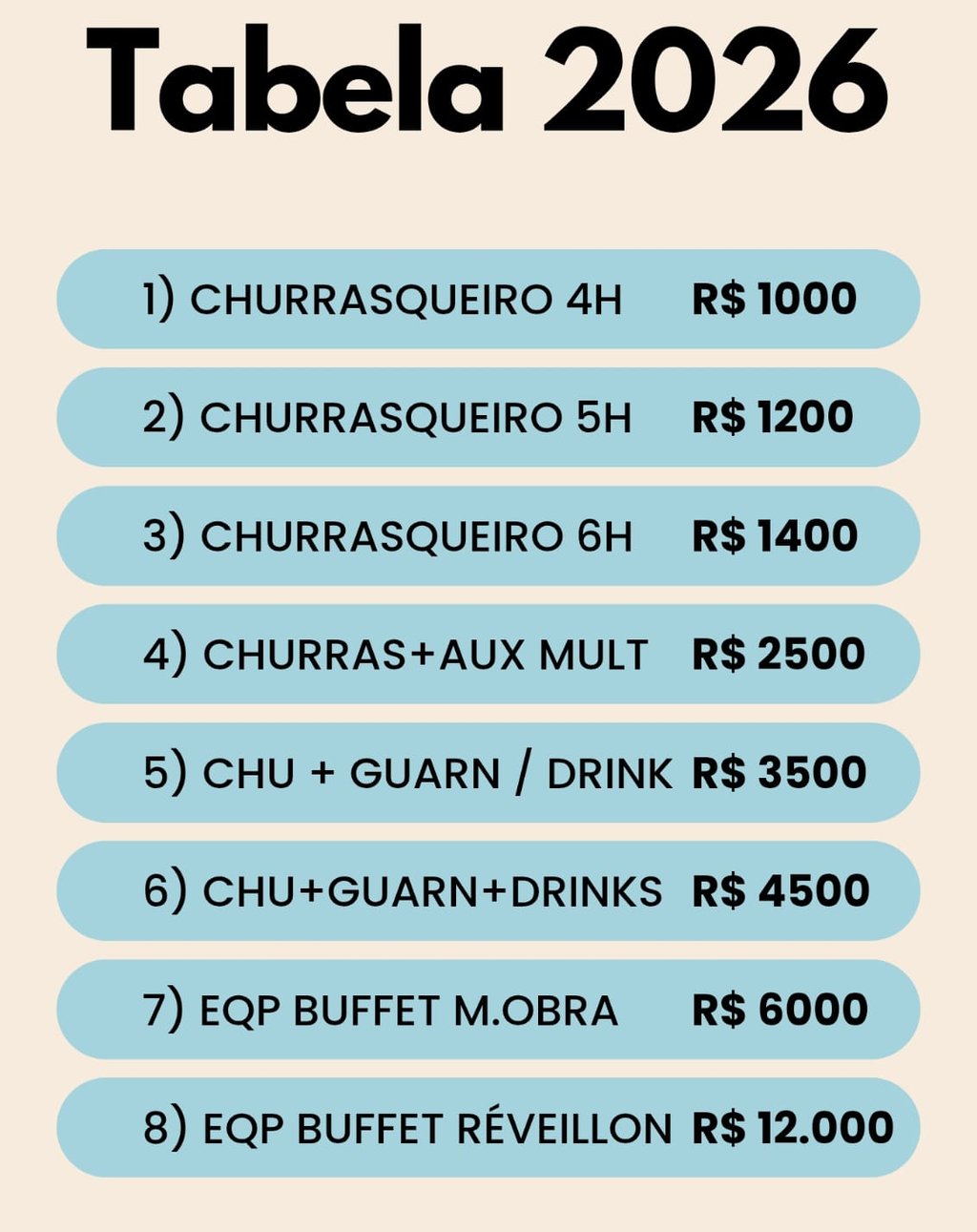 As opções de 5 a 8 atendem eventos até 50 pessoas.
