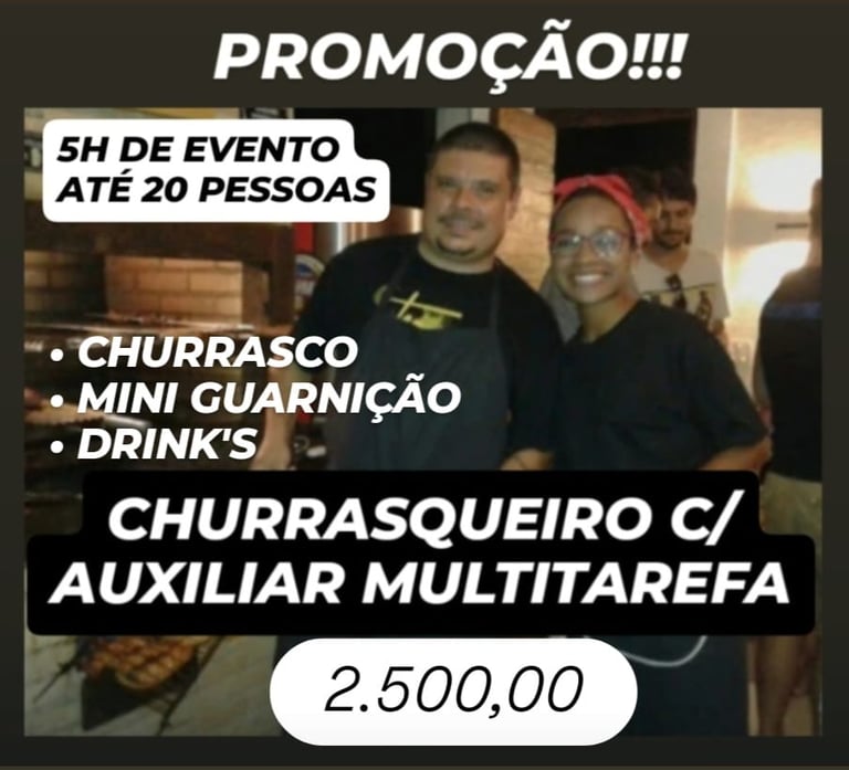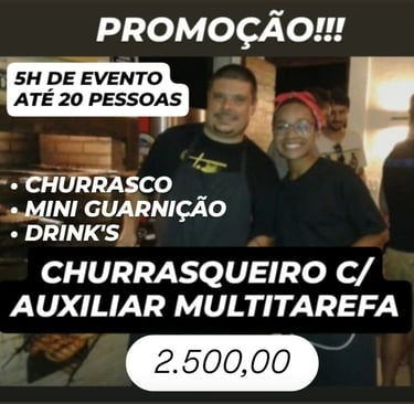 CHURRASCO + MINI GUARNIÇÃO OU CHURRASCO + DRINK'S (CAIPIRINHAS) OU OS 3 ATENDIMENTOS.