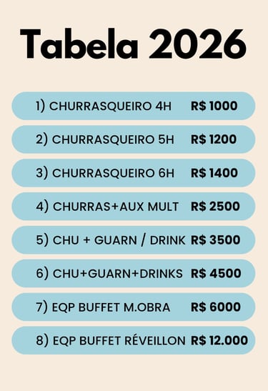 Atendemos festas e eventos com os seguintes serviços: Churrasqueiro, Cozinheira, Bartender e Garçonetes Auxiliares.